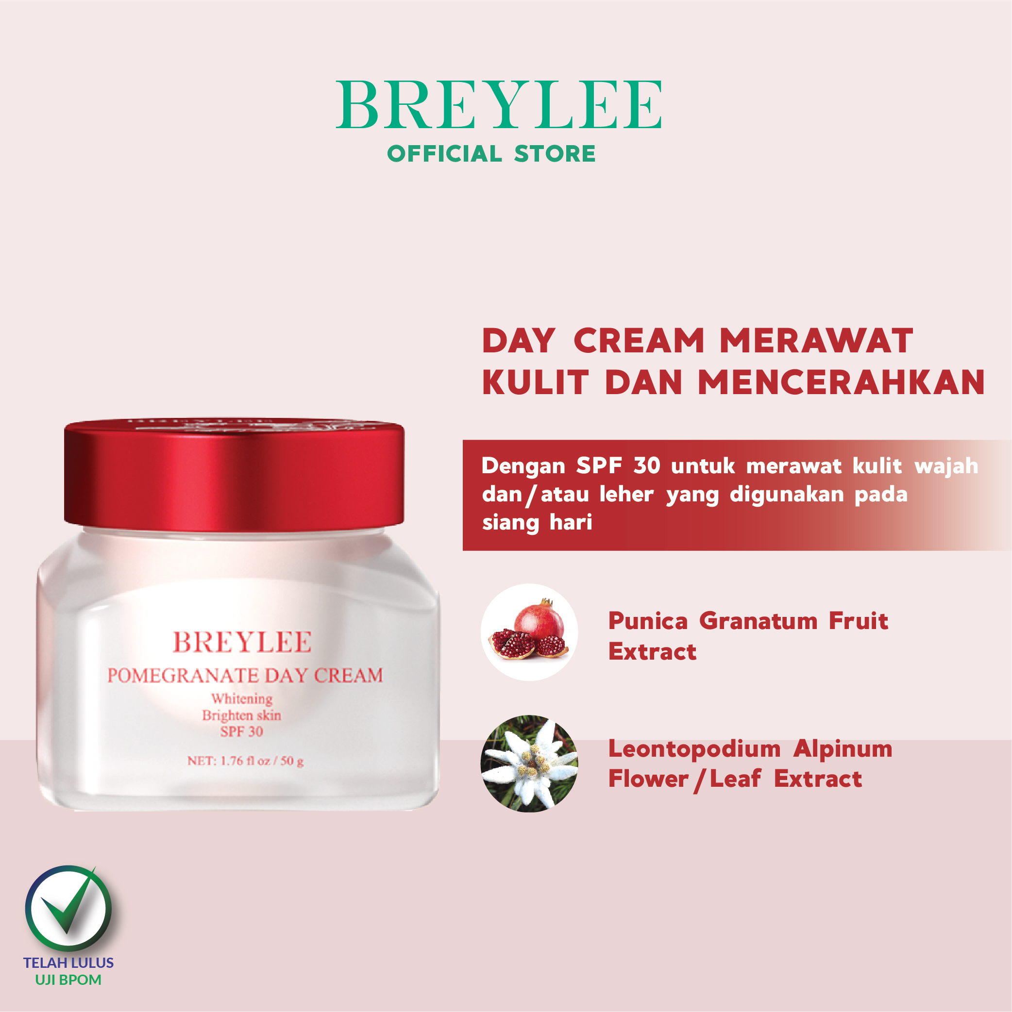 Dengan SPF 30 yang membuat efek cerah dan lembab, membuat kulit segar dengan Esensi buah delima merah yang kaya anti-oksidan. Dapat memperbaiki kulit dari bagian bawah permukaan kulit. Dengan tekstur ringan, tidak lengket dan mudah menyerap.